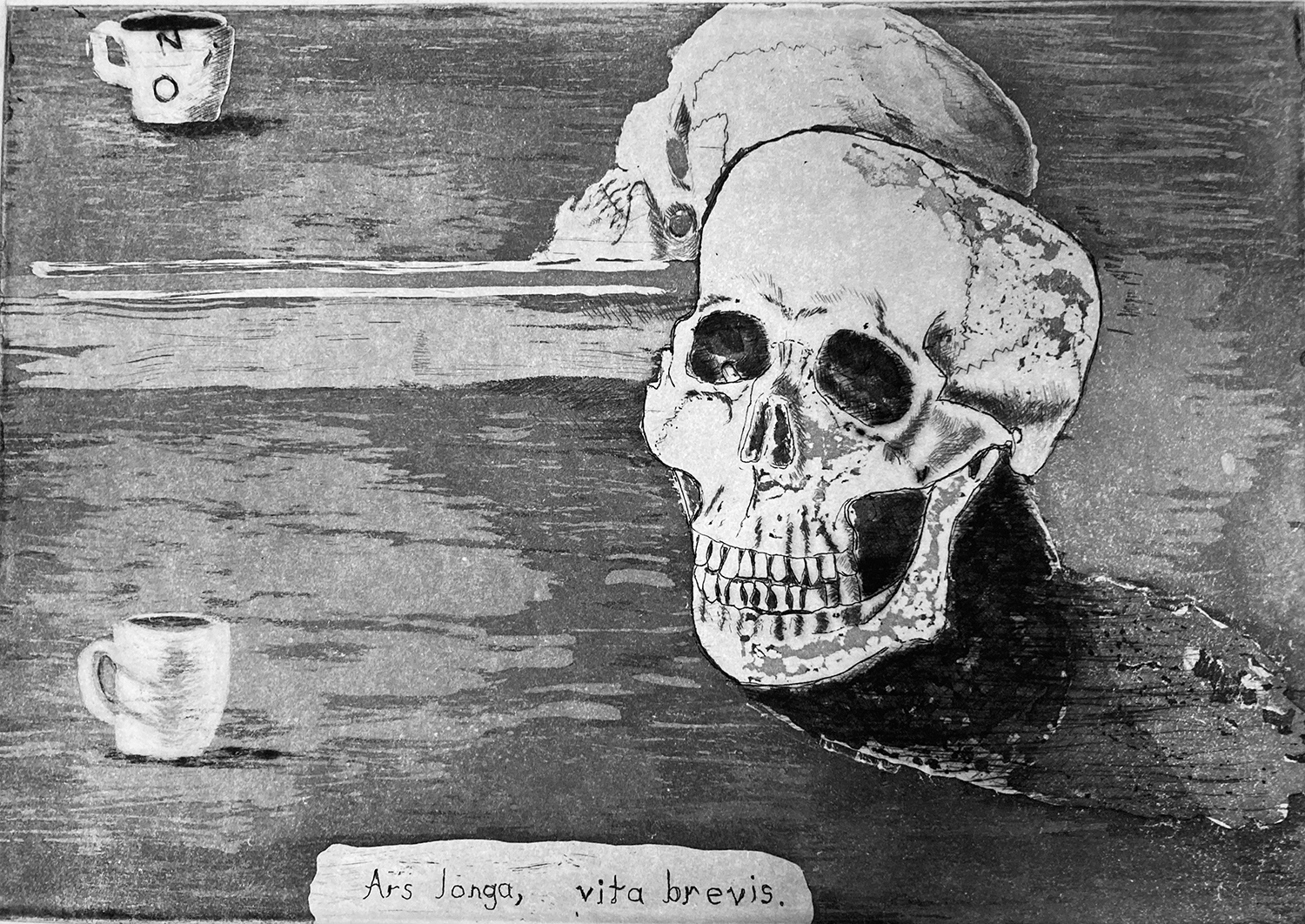Formée à plusieurs techniques à l’université de Californie dans les années 1980, j’ai voulu utiliser mon art comme une arme contre la politique de Ronald Reagan. La photogravure au service de la révolte, tels les photomontages de John Heartfield des années 1930. Installée en France depuis 1985, travaillant seule et en atelier, je poursuis ma recherche picturale en peinture—natures-mortes, paysages, intérieurs, autoportraits—et en gravure, entamant récemment une série sur le motif de la barque, une autre sur les vanités.